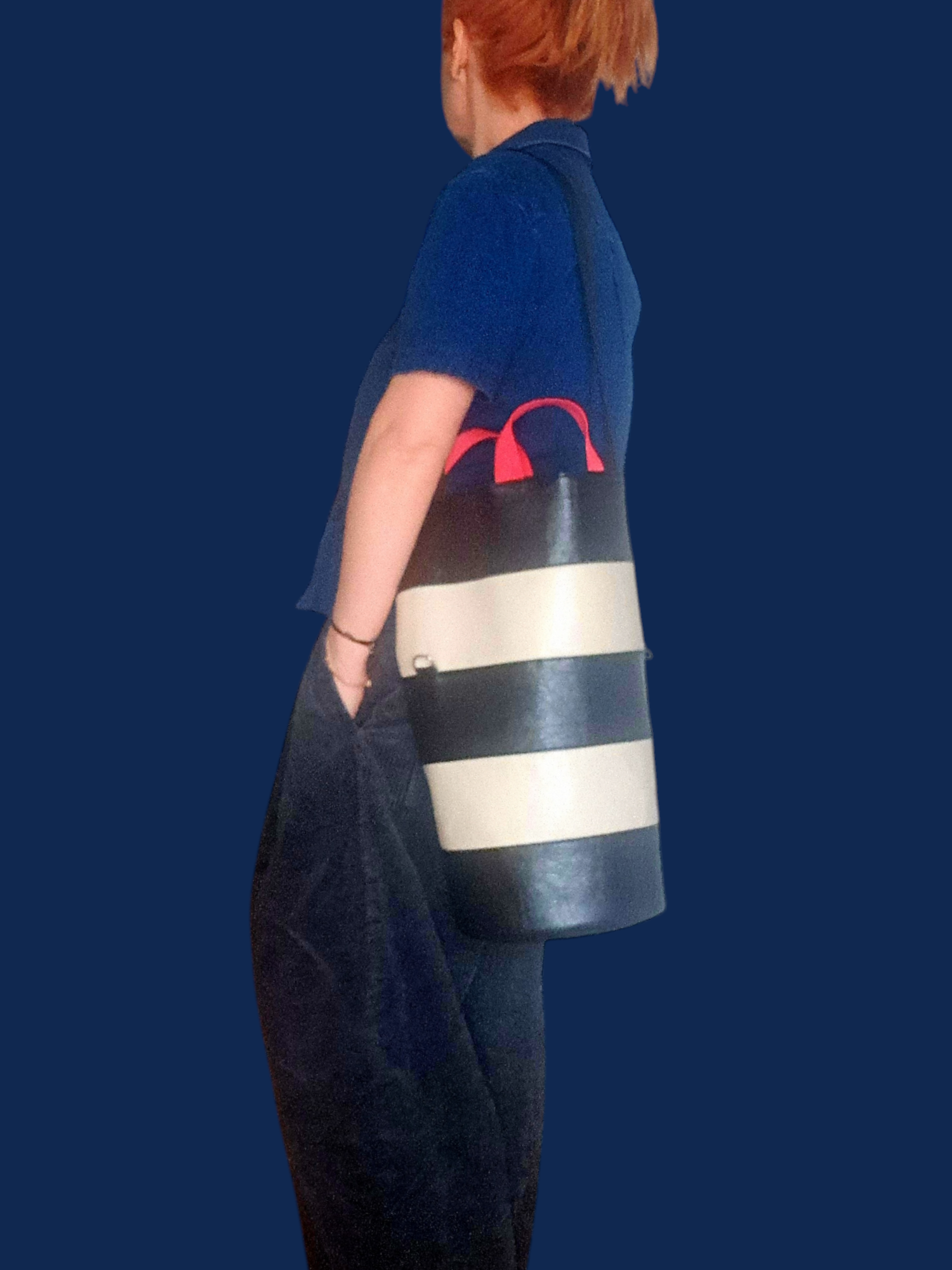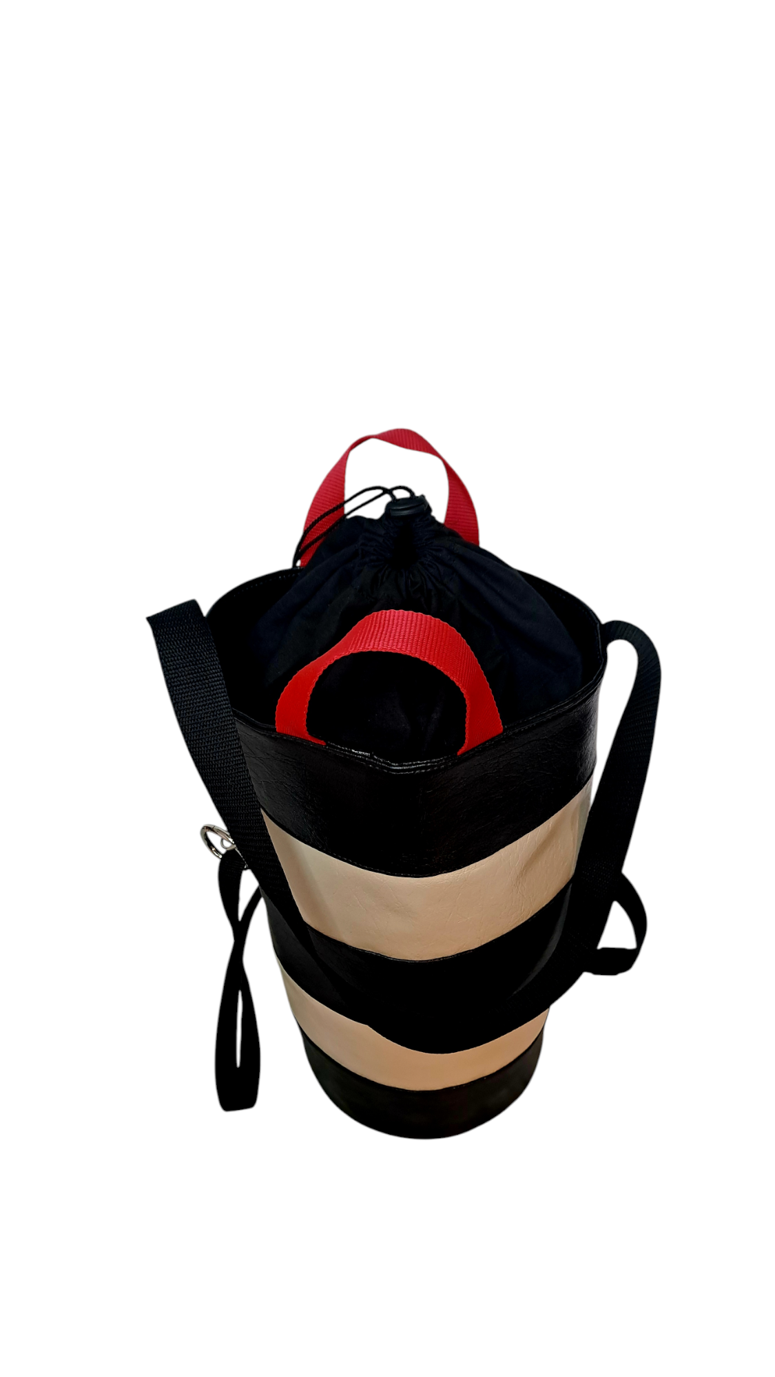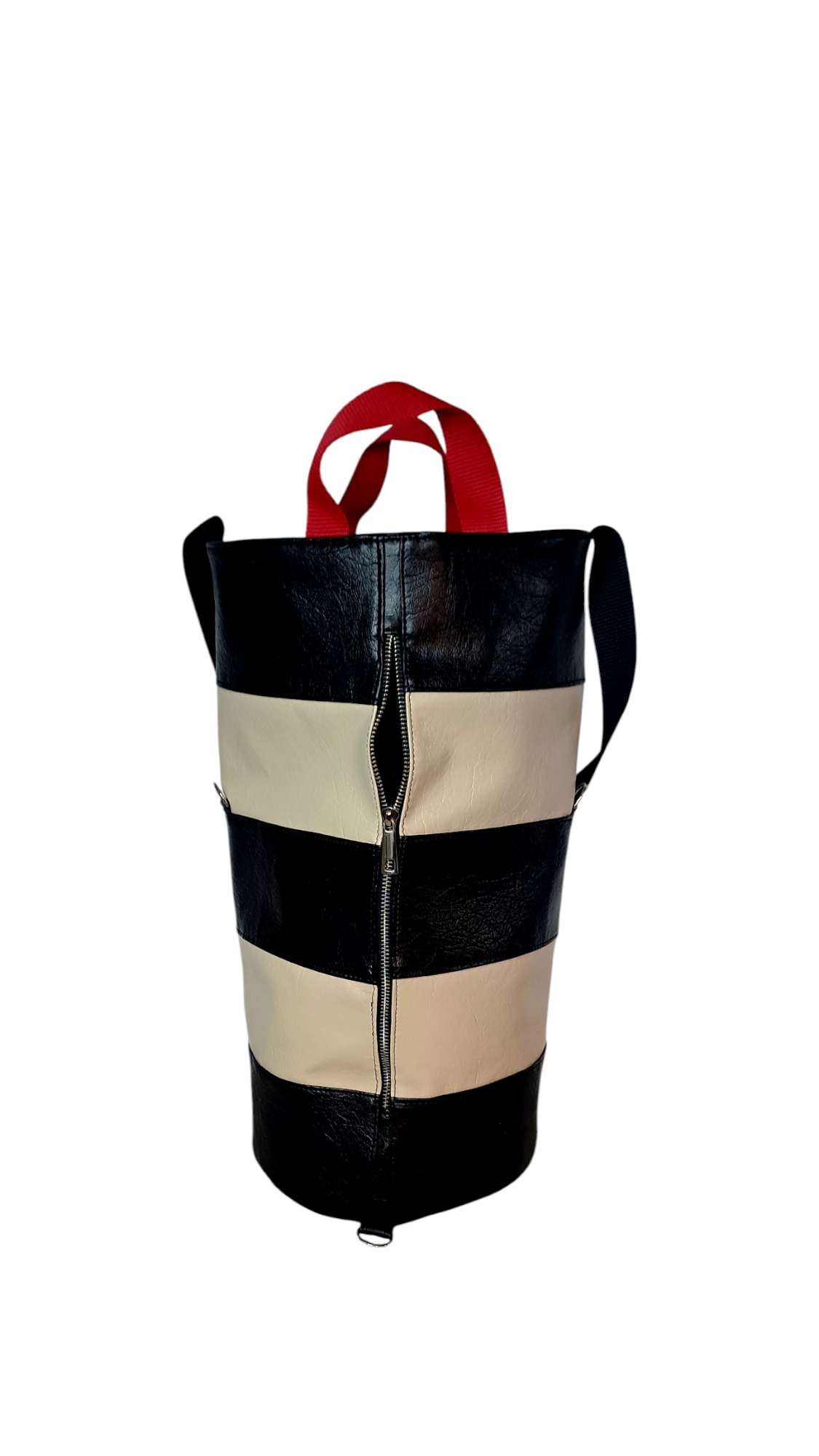 The long Džaak is made from high-quality faux leather and marine-grade faux leather. It closes at the top with a drawstring stopper, and features a full-length zipper on the back.